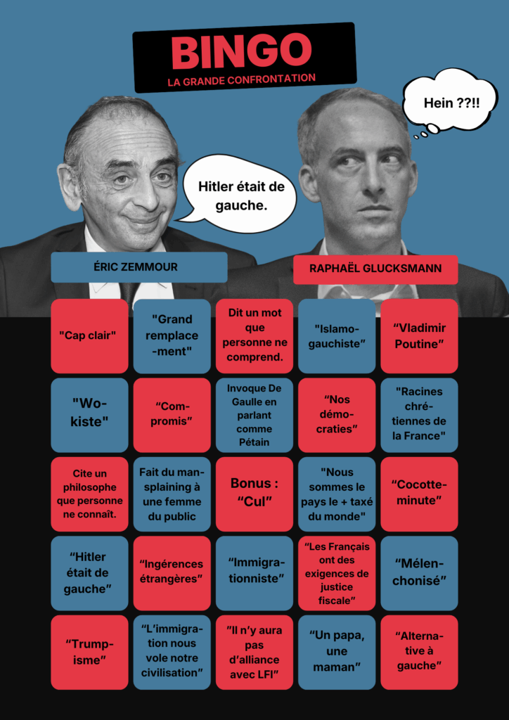 « Hitler était de gauche », « une famille, c’est un papa et une maman », « l’immigration nous vole notre civilisation » : parce qu’il est bon, parfois, de rire de ce qui nous scandalise, nous vous avons concocté un Bingo pour fêter ça.